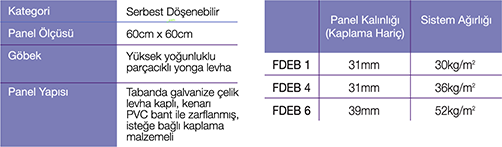 Serbest döşenebilir, 60x60 ebadındaki yüksek yoğunluklu parçacıklı yonga levha dan mamul panellerin, yüzey ve tabanı galvanize çelik kaplanmıştır. Tercih edilen kaplama, köşe ve kenar kaplamaları yapılmadan önce, panel yüzeyine lamine edilir. Bu işlemden sonra kenarlar ve köşeler bir ABS bant ile kaplanarak yüzey kaplaması ve göbeğin tamamen zarflanarak korumaya alınması sağlam. Elektriksel akımın devamlılığı panelden çelik tabana ve taşıyıcı ayaklara kesintisiz bir şekilde sağlanır. Döşeme panellerinin doğru yerleştirilerek, yerine tam ve kalıcı oturması, kalıptan çıkarılmış özel plastik geçme kapaklar sayesinde sağlanır.