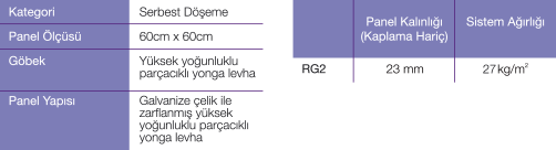 İç yapısı yüksek yoğunluklu parçacıklı yonga levhadan mamul; tamamı galvanize çelik zarflanmış, PSA MOB PF2 PS/SPU ve BSEN 12825 standartlarına uyumlu, serbest döşenebilir yükseltilmiş döşeme panelleri.