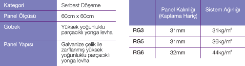 İç yapısı yüksek yoğunluklu parçacıklı yonga levhadan mamul; tamamı galvanize çelik zarflanmış, PSA MOB PF2 PS/SPU ve BSEN 12825 standartlarına uyumlu, serbest döşenebilir yükseltilmiş döşeme panelleri.